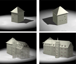 Ausschnitte einer Computeranimation der Bauhaus-Universität Weimar. Es ist deutlich zu erkennen, wie das Renaissanceschloss an den gotischen Wohnturm angegliedert wurde.