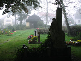 Die Kirchhofkapelle stammt wahrscheinlich aus dem Jahr 1686 (Jahreszahl und Wappen v. Bünau an der Wetterfahne)